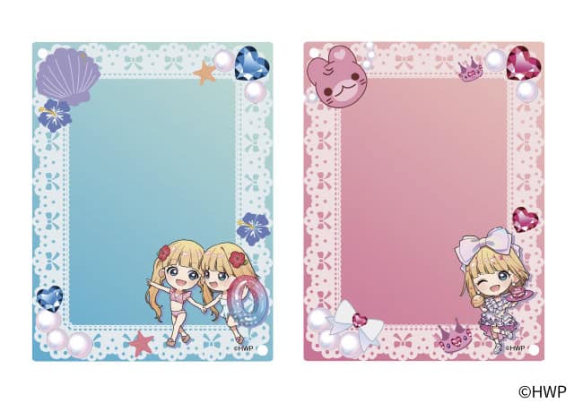 アクリルブロマイドケースです。2枚のアクリルが重なっていて、上がイラスト・デザイン面、下が背景面になっていて、間にブロマイドを入れて持ち運べるグッズです。